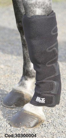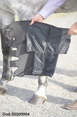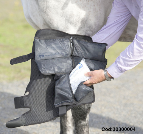 Fácil aplicación, reduce la inflamación, duración apróximada 2 horas; De compresión uniforme y segura, diseñado con materiales especiales que se amoldan y mantienen la temperatura fría evitando quemar al caballo, fuertes velcros asegurando la fijación y firmeza para obtener una óptima aplicación. Sachet reutilizable del freezer al caballo.